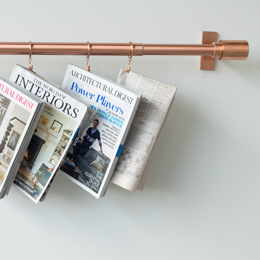 1. Keeping your magazines in-line. Love your magazines and newspapers, but feeling overwhelmed by the stacks of them sitting on your coffee table? Grab a curtain rod and string them up with curtain rings for an attractive display.
