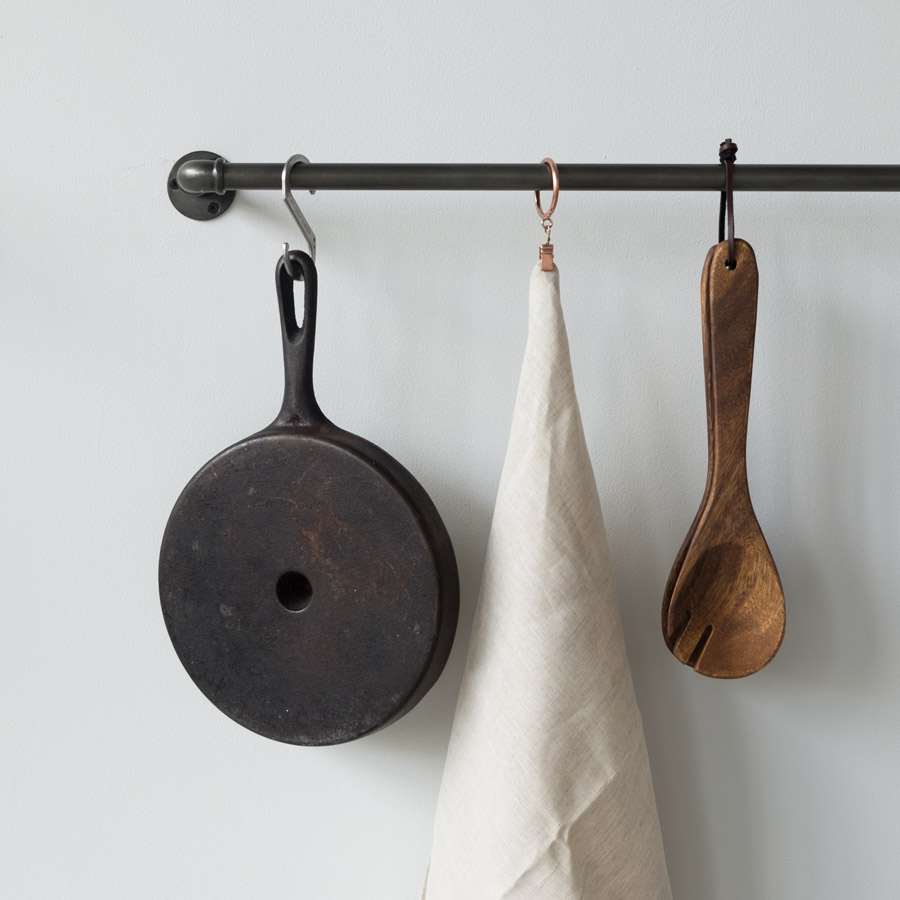 2. Think outside the crock. Keep all of your kitchen essentials on-hand with an industrial-style curtain rod hung above your counter. Using S-hooks and clips, you can hang everything from your favorite skillet to dishtowels.