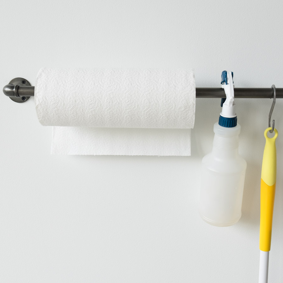 5. Corral your cleaning supplies. If you’re short on closet space or just want to keep your house-cleaning essentials on-hand, you can turn to—you guessed it—a curtain rod! The perfect form for holding a roll of paper towels, you can also utilize S-hooks to hang brooms, dustpans, and a bottle of all-purpose cleaner.